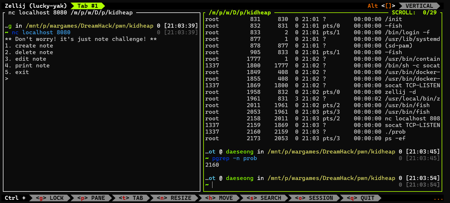 nc로 컨테이너에 문제에 접근하고 ps -ef명령어로 돌아가는 프로세스들을 살펴보면 컨테이너 내에 socat 이랑./prob 바이너리가 돌아가는 게 보인다. pgrep으로도 잡을 수 있고 물론 아래 명령어로 GDB 어태치도 가능하다(이건 sudo 권한 필요)